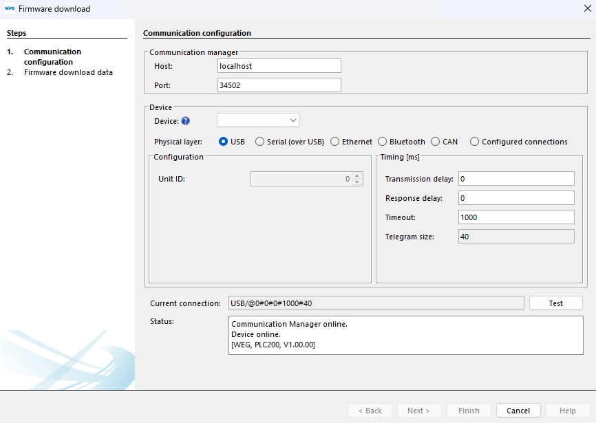 2) Configure a comunicação, selecionando o produto na lista, depois a camada física e ajustando demais configurações, caso necessário. Mais informações estão disponíveis em Comunicação.