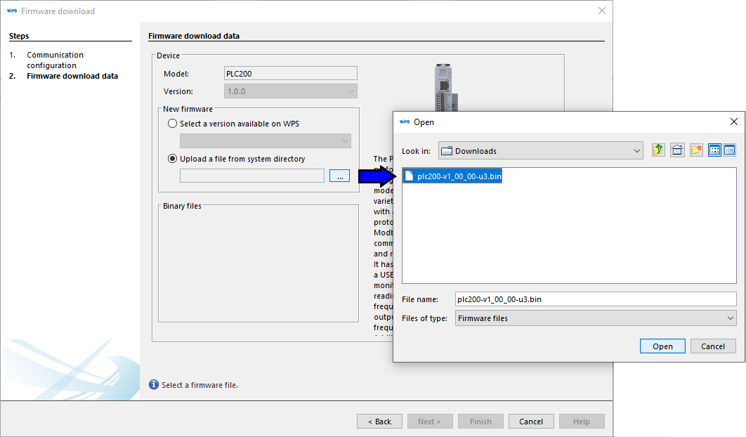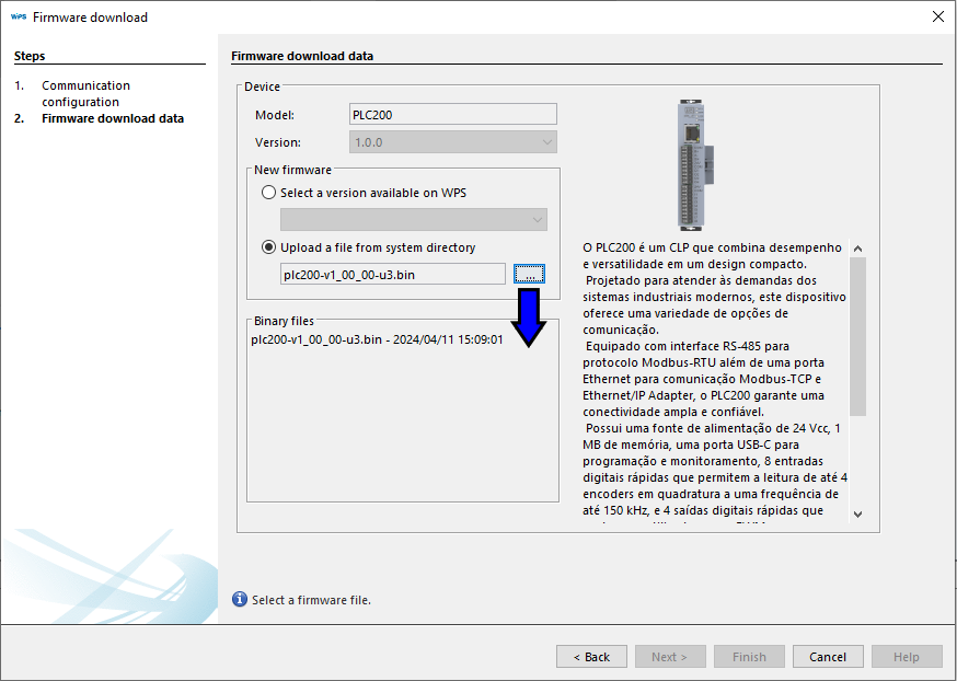 4) Na tela seguinte, clique em "..." e selecione o arquivo binário (extensão .bin) que foi previamente fornecido.