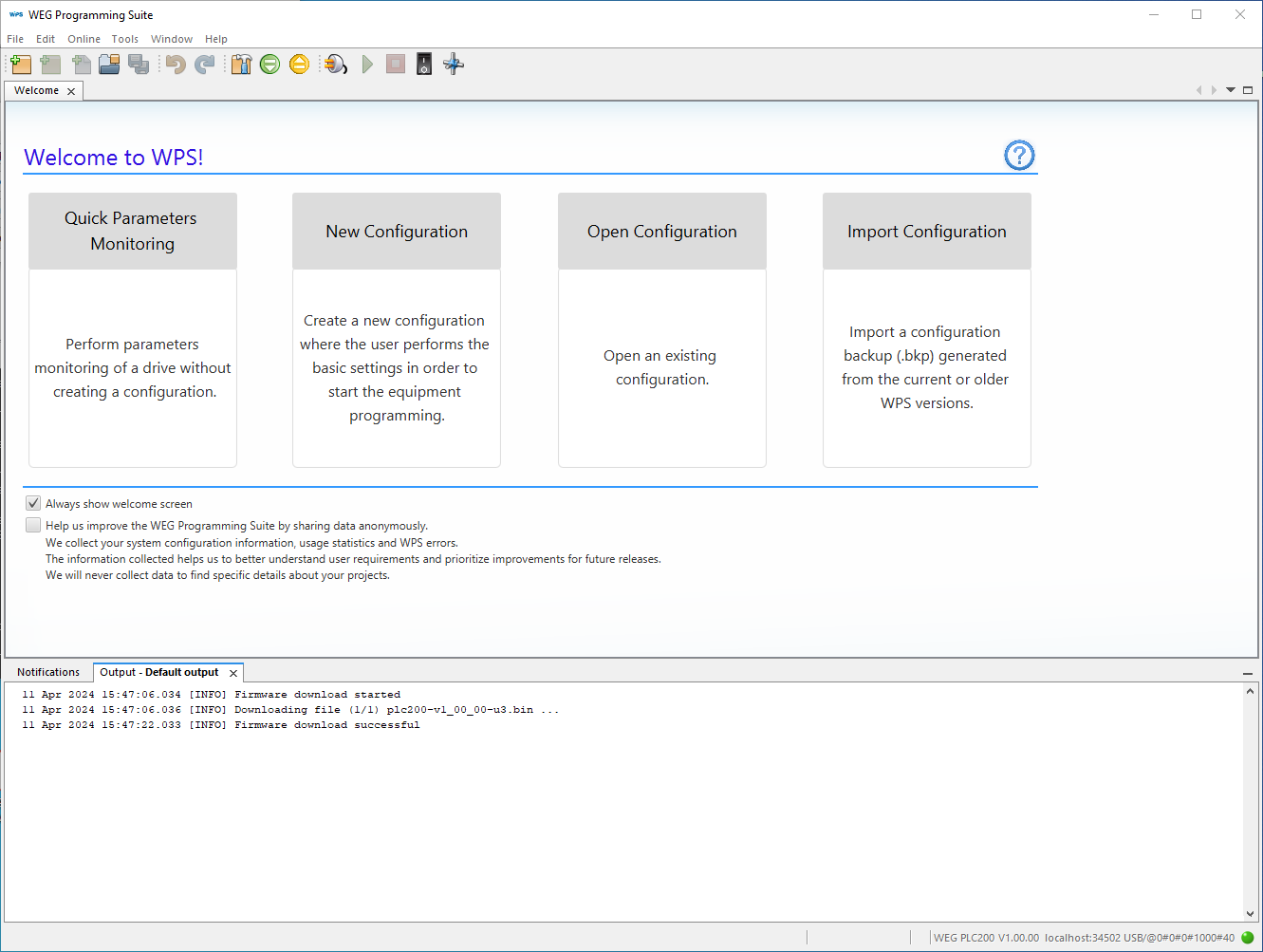 1) Conecte o dispositivo ao computador e certifique-se de que esteja energizado. Não é necessário ter um projeto ou recurso criado no WPS.