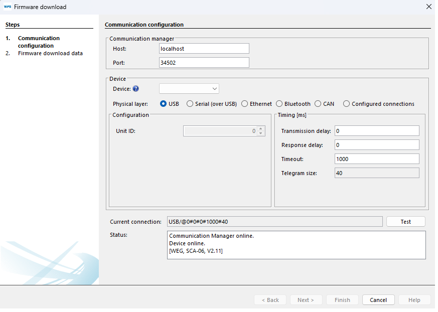 2) Configure a comunicação, selecionando o produto na lista, depois a camada física e ajustando demais configurações, caso necessário. Mais informações estão disponíveis em Comunicação.