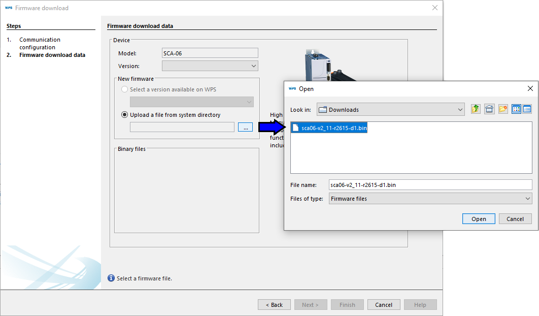 NOTA! O processo de atualização de firmware não será concluído caso o arquivo binário seja incompatível ou esteja corrompido. Antes de atualizar o firmware, interrompa a execução de programas e certifique-se que o dispositivo não esteja em operação (girando motor).