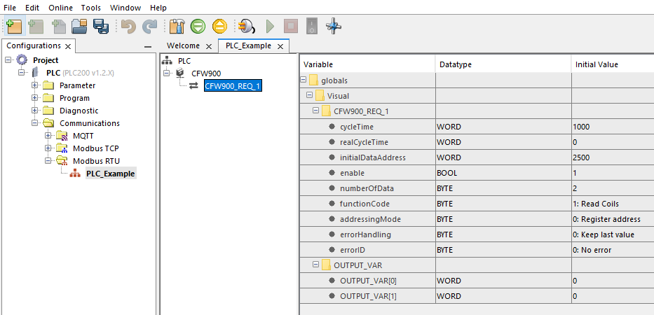 NOTA! Ao usar o Configurador Modbus para criar a rede Modbus, o configurador criará variáveis globais do tipo MODBUS para os dispositivos e variáveis do tipo MB_REQUEST para as requisições.