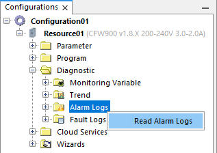 2. Após executada a etapa de ler logs, o arquivo de logs será automaticamente criado com um nome composto com a data e hora atual e com todos alarmes e falhas presentes no equipamento lidos.