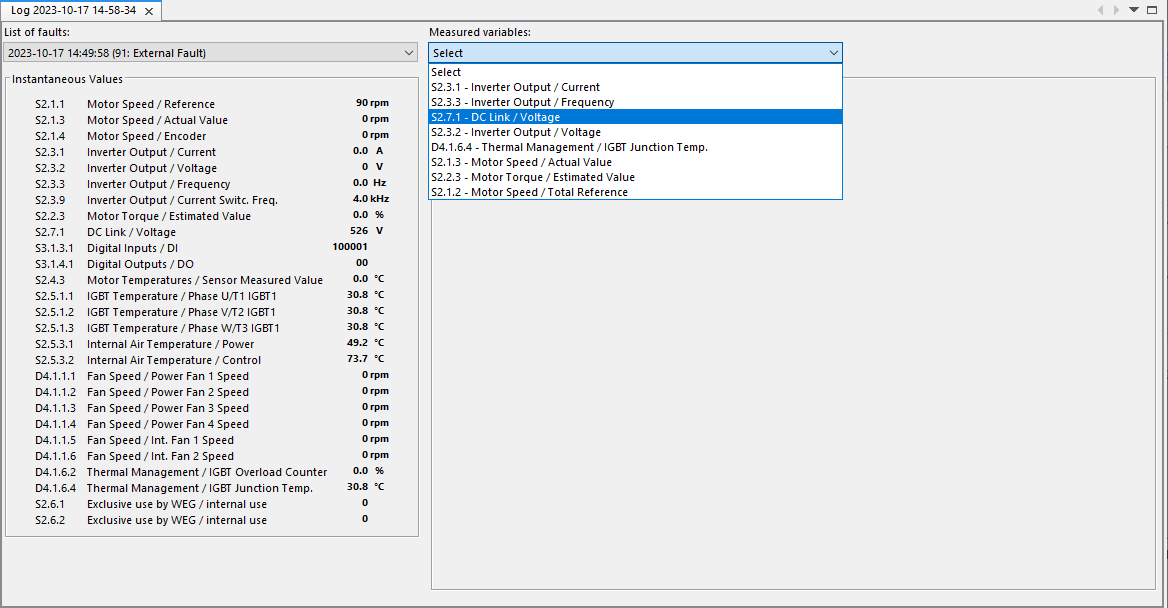 A partir da seleção de uma falha na lista, será aberta uma janela contendo informações de parâmetros de Status do dispositivo e será possível visualizar graficamente algumas variáveis: