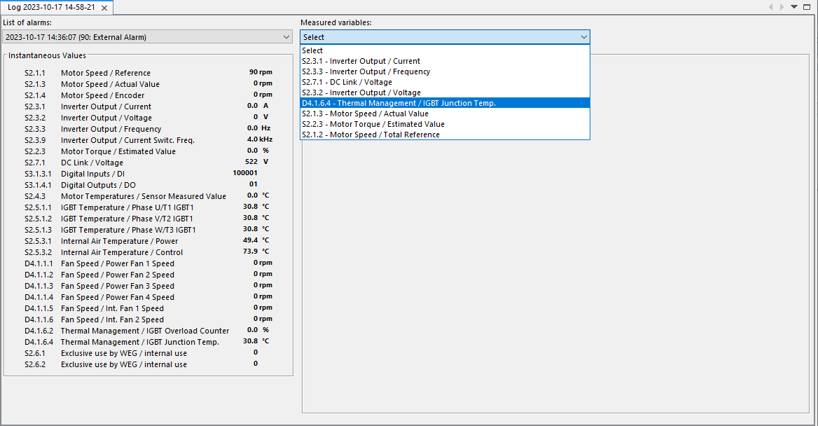 Após abrir um arquivo de logs, pode-se selecionar um evento a partir da Lista de alarmes conforme abaixo: