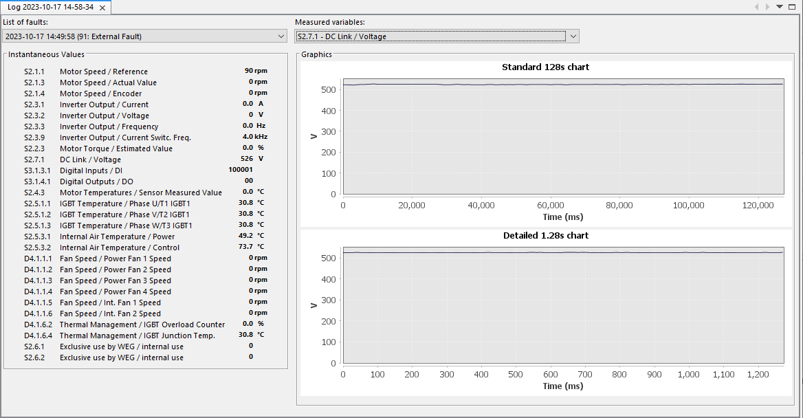 A partir da seleção de uma falha na lista, será aberta uma janela contendo informações de parâmetros de Status do dispositivo e será possível visualizar graficamente algumas variáveis: