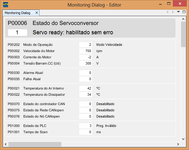 | P00002 | Velocidade do Motor | Indica o valor da velocidade real em rpm do servomotor, exceto quando for programado para receber realimentação de posição/velocidade externa |
