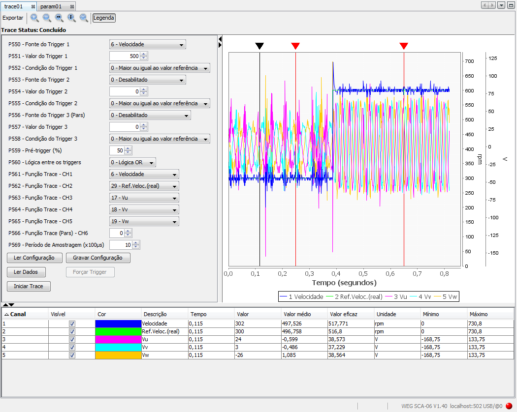 5. Após a trigger ocorrer, o gráfico e os valores serão exibidos na tabela e o estado da função trace será Concluído.