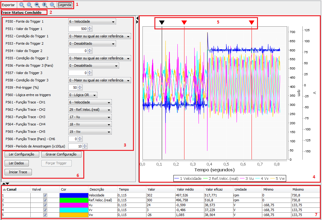 A função trace é utilizada para registrar variáveis* de interesse do equipamento (como corrente, tensão, velocidade, etc) quando ocorre um determinado evento no sistema. Este evento no sistema, por desencadear o