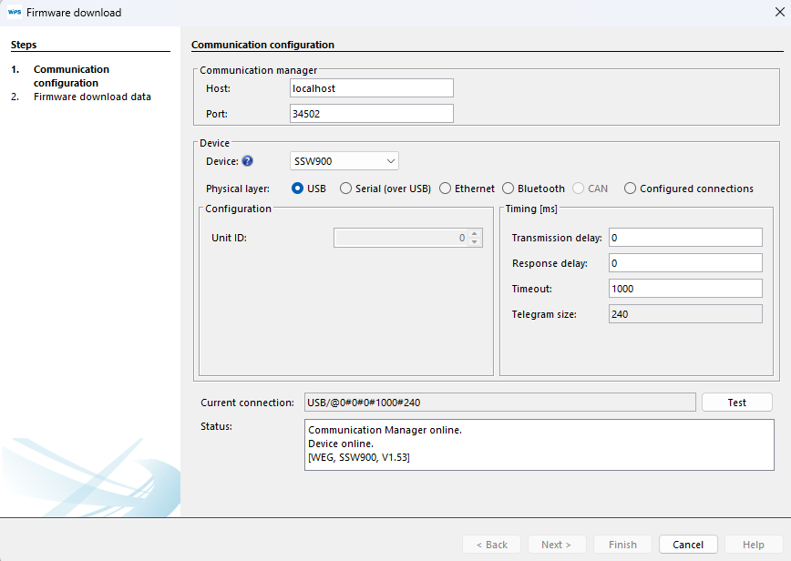 NOTA! Para atualizar o firmware do acessório Ethernet (SSW900-CETH-W), defina o ID 254 nas configurações de comunicação. Consulte o manual do produto sobre o ajuste do endereço IP e porta nos parâmetros P0850 a P0855 e P0865.