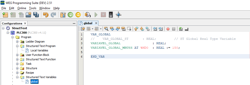 | • | VARIAVEL GLOBAL_MBUSS: variável com endereço Modbuss "0" do tipo REAL e com valor inicial 150. |