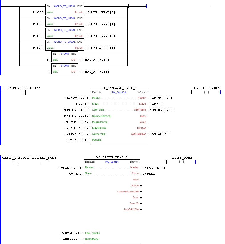 MW_CAMCALC_INST_0.Execute := CAMCALC_EXECUTE; MW_CAMCALC_INST_0( Master:=0, Slave:=0, CamTable:=NUM_OF_TABLE, NumberOfPoints:=PTS_OF_ARRAY, MasterPoints:=M_PTS_ARRAY, SlavePoints:=S_PTS_ARRAY, CurveType:=CURVE_ARRAY, Periodic:=1); CAMTABLEID := MW_CAMCALC_INST_0.CamTableID; CAMCALC_DONE := MW_CAMCALC_INST_0.InSync;