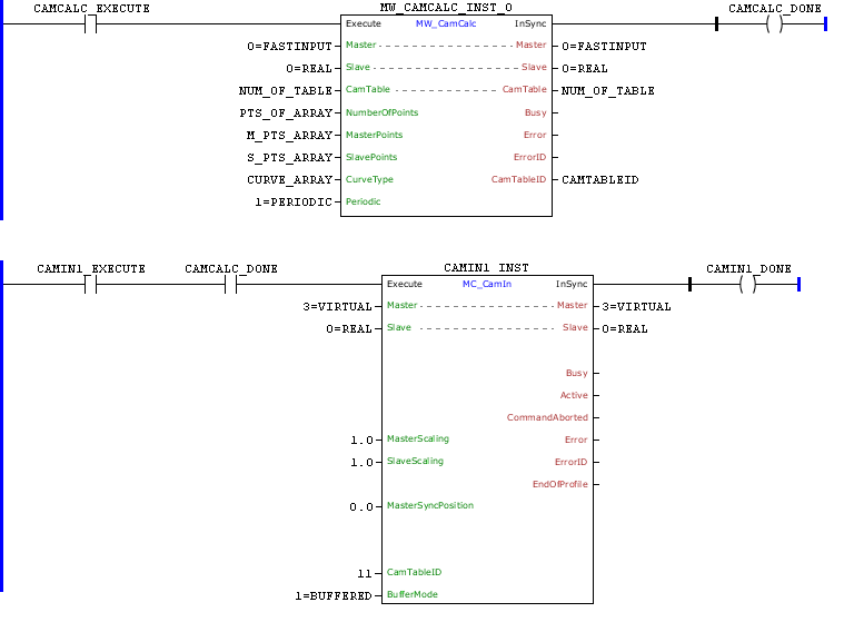 MW_CAMCALC_INST_0.Execute := CAMCALC_EXECUTE; MW_CAMCALC_INST_0( Master:=0, Slave:=0, CamTable:=NUM_OF_TABLE, NumberOfPoints:=PTS_OF_ARRAY, MasterPoints:=M_PTS_ARRAY, SlavePoints:=S_PTS_ARRAY, CurveType:=CURVE_ARRAY, Periodic:=0); CAMTABLEID := MW_CAMCALC_INST_0.CamTableID; CAMCALC_DONE := MW_CAMCALC_INST_0.InSync;