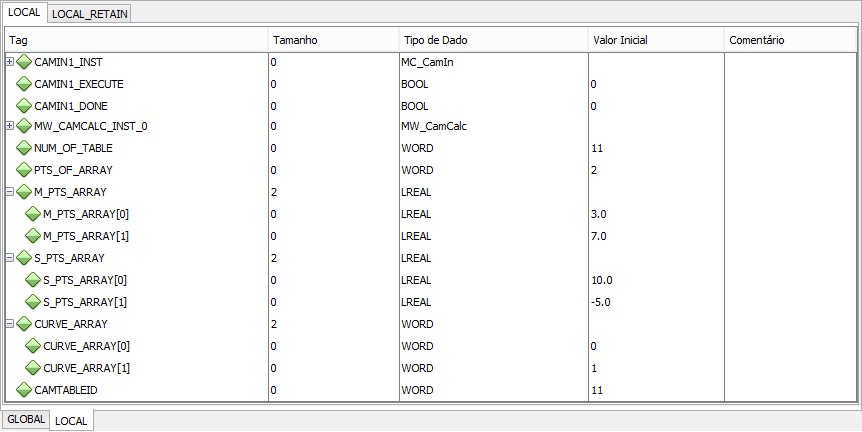 VAR CAMCALC_EXECUTE, CAMCALC_DONE, CAMIN1_EXECUTE, CAMIN1_DONE : BOOL; NUM_OF_TABLE, PTS_OF_ARRAY : WORD; CAMTABLEID : UINT; CURVE_ARRAY : ARRAY [0..1] OF WORD; M_PTS_ARRAY, S_PTS_ARRAY : ARRAY [0..1] OF LREAL; MW_CAMCALC_INST_0 : FB_MW_CamCalc; MC_CAMIN_INST_0 : FB_MC_CamIn; END_VAR